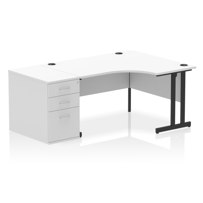 • Impulse contract 1400 wide desk • 25mm tops • Heat resistant melamine finish • 18mm modesty panels • 2mm protective abs edging • Cable managed legs • 2 cable ports • Height adjustable feet • Steel to steel fixings • 2 modesty panels slots • Deep set modesty panel (5″) allows for compatibility of most screen clamp fittings • Fixed pedestal