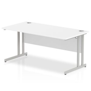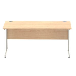 Impulse contract desk | 25mm tops | Heat resistant melamine finish | 18mm modesty panels | 2mm protective abs edging | Silver coated double strut legs | 2 cable ports | Height adjustable feet | Steel to steel fixings | 2 modesty panels slots Deep set modesty panel (5″) allows for compatibility of most screen clamp fittings | Weight Capacity 135Kg