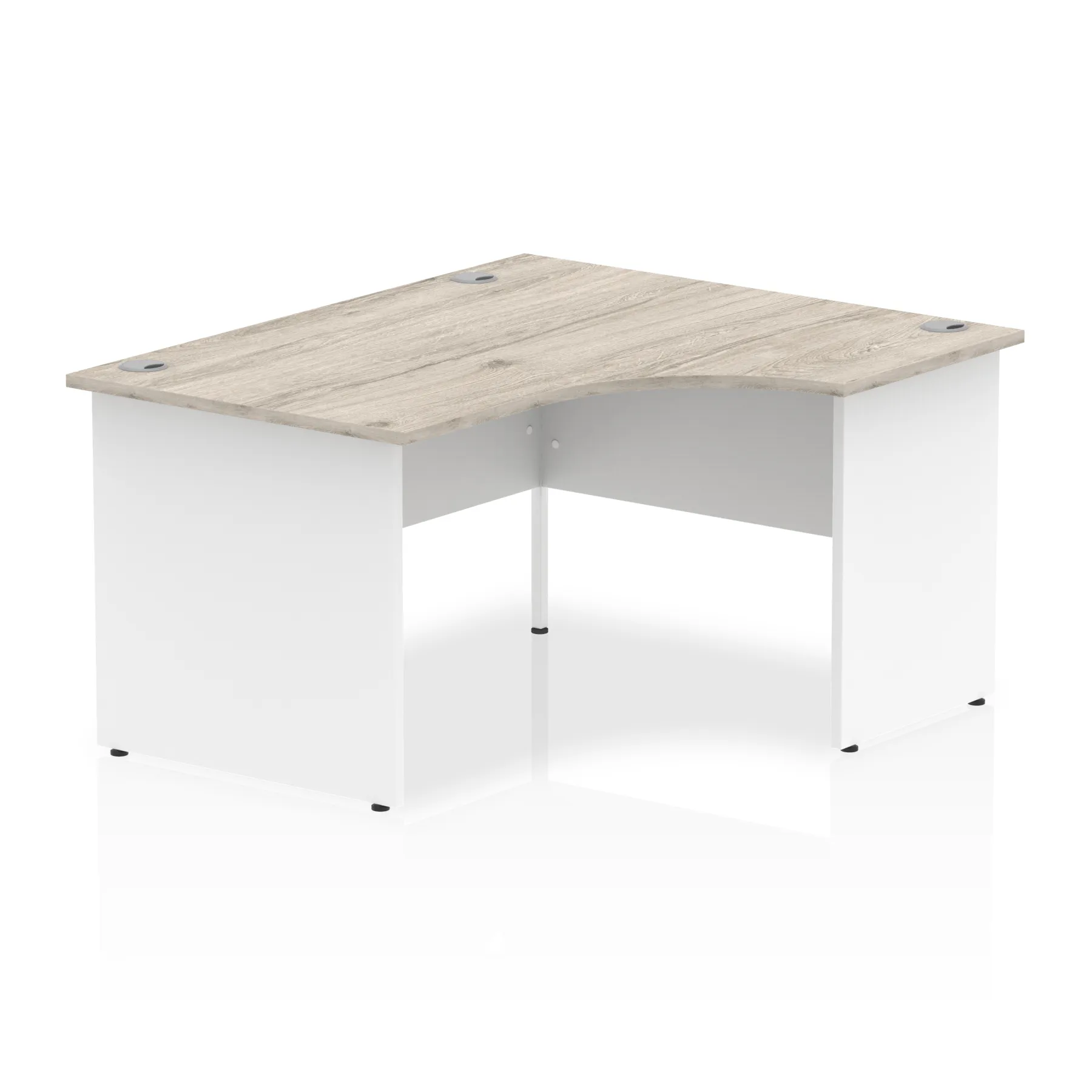 Impulse contract 1400 wide crescent desk | 25mm tops | Heat resistant beech melamine finish | 18mm modesty panel | 2mm protective abs edging | Matching wood panel end legs | 3 cable ports | Height adjustable feet | Steel to steel fixings | 3 modesty panel slots | 600 deep | Deep set modesty panel (5″) allows for compatibility of most screen clamp fittings | Weight Capacity 135Kg